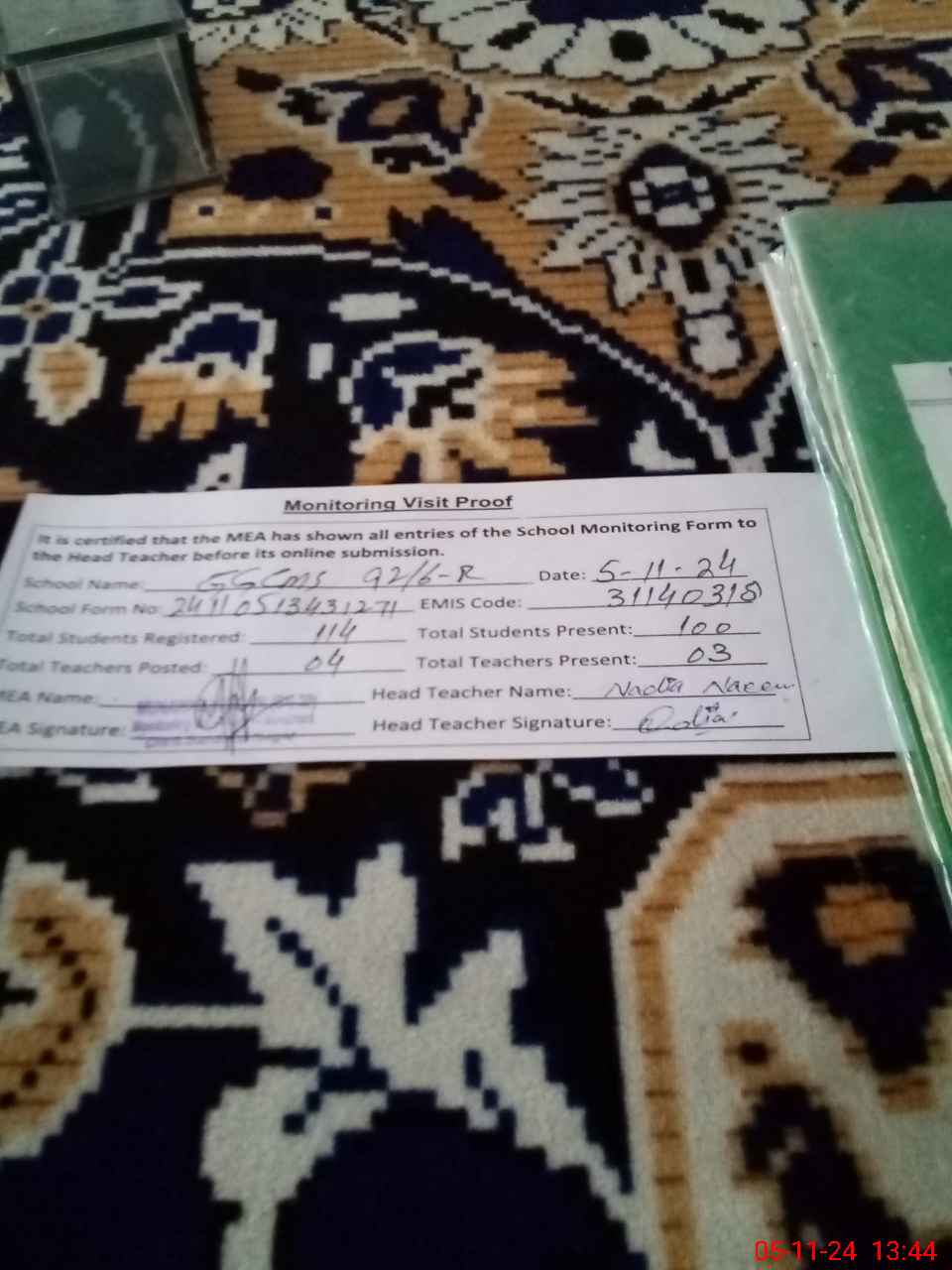 | Attendance Register | Head Teacher | MEA with School | Visit Proof |