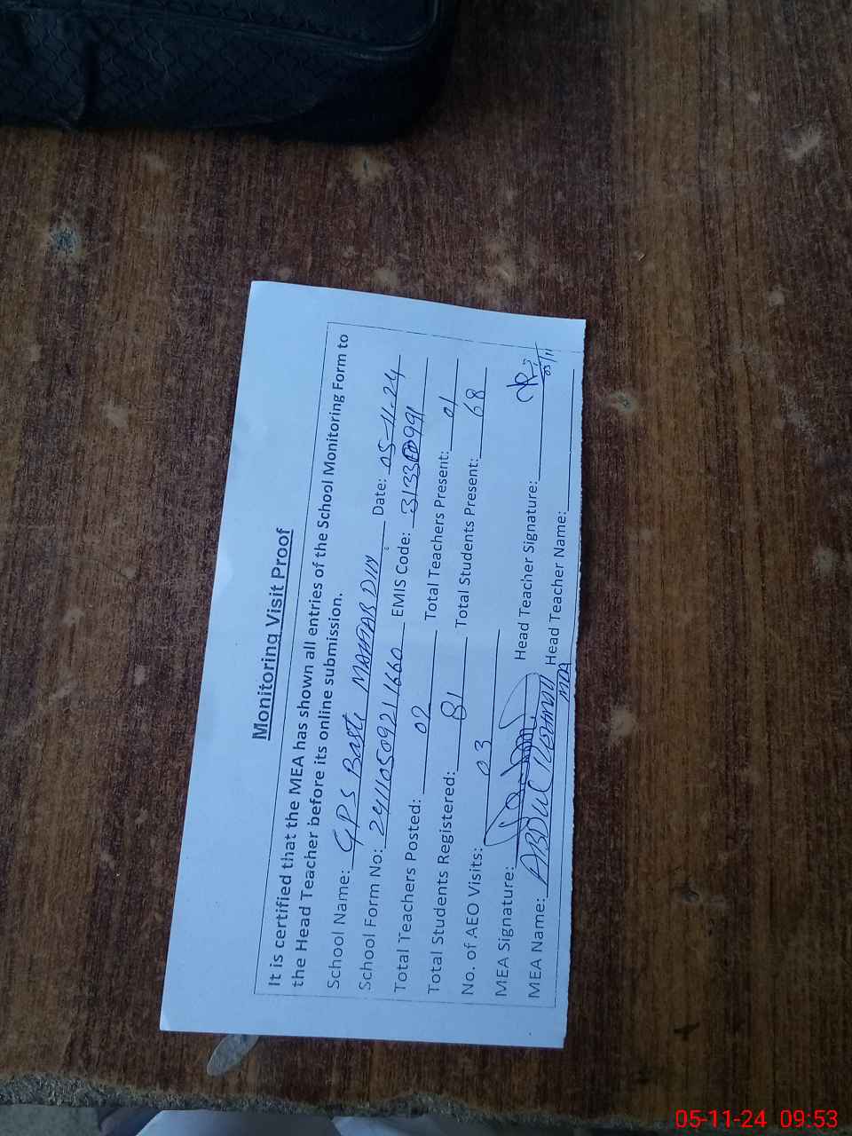 | Attendance Register | Head Teacher | MEA with School | Visit Proof |