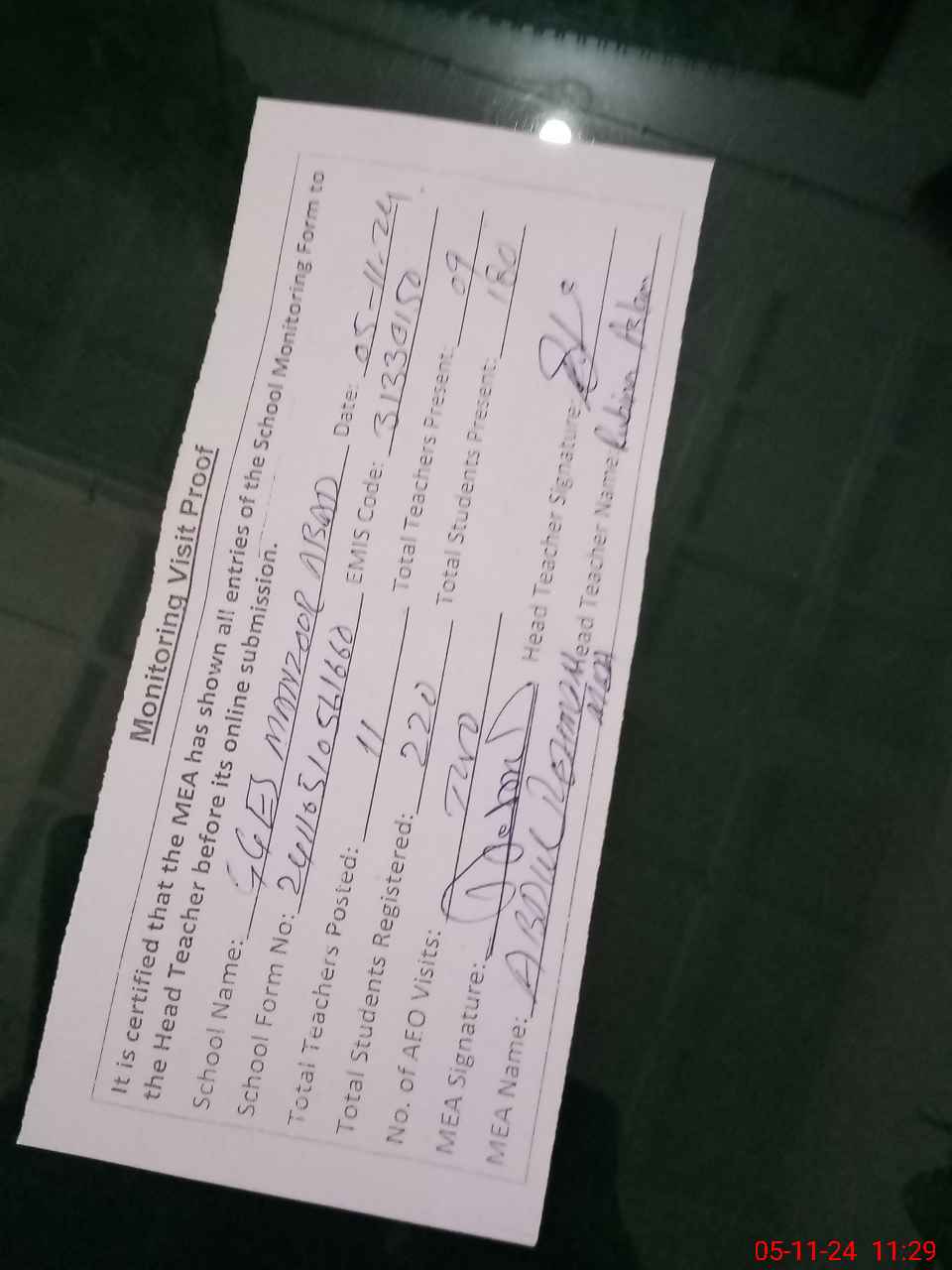 | Attendance Register | Head Teacher | MEA with School | Visit Proof |