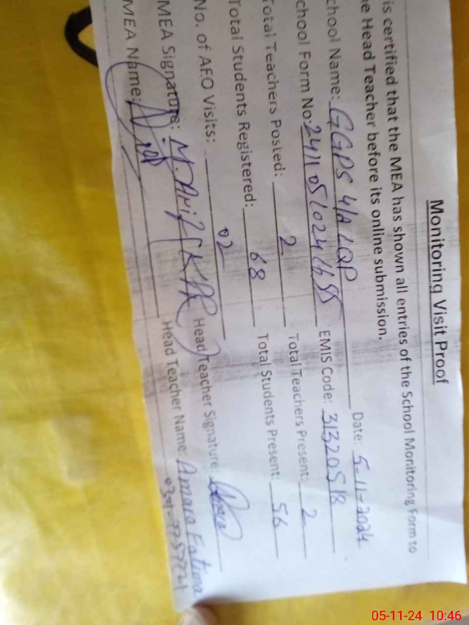 | Attendance Register | Head Teacher | MEA with School | Visit Proof |