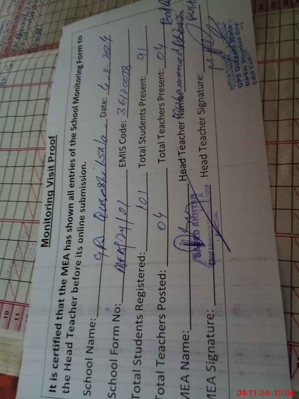 | Attendance Register | Head Teacher | MEA with School | Visit Proof |