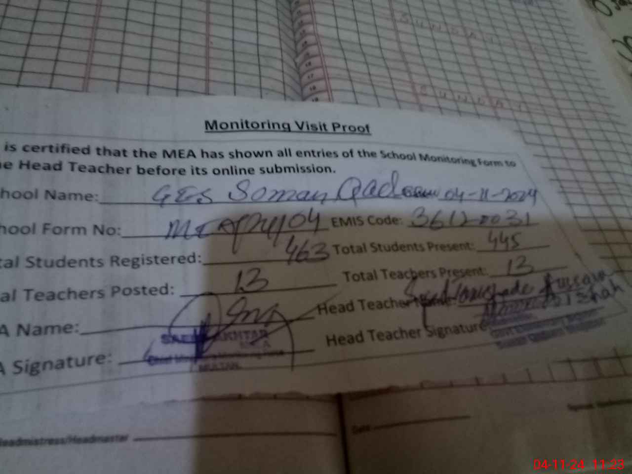 | EMIS Code: 36120031 | Name of School: GES SOMAN QADEEM P/O AGHAR KHAWANI | |||