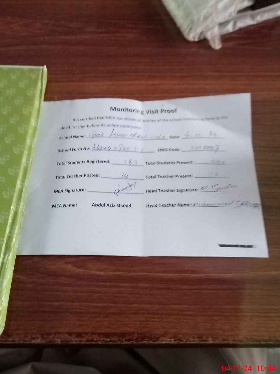 | Attendance Register | Head Teacher | MEA with School | Visit Proof |