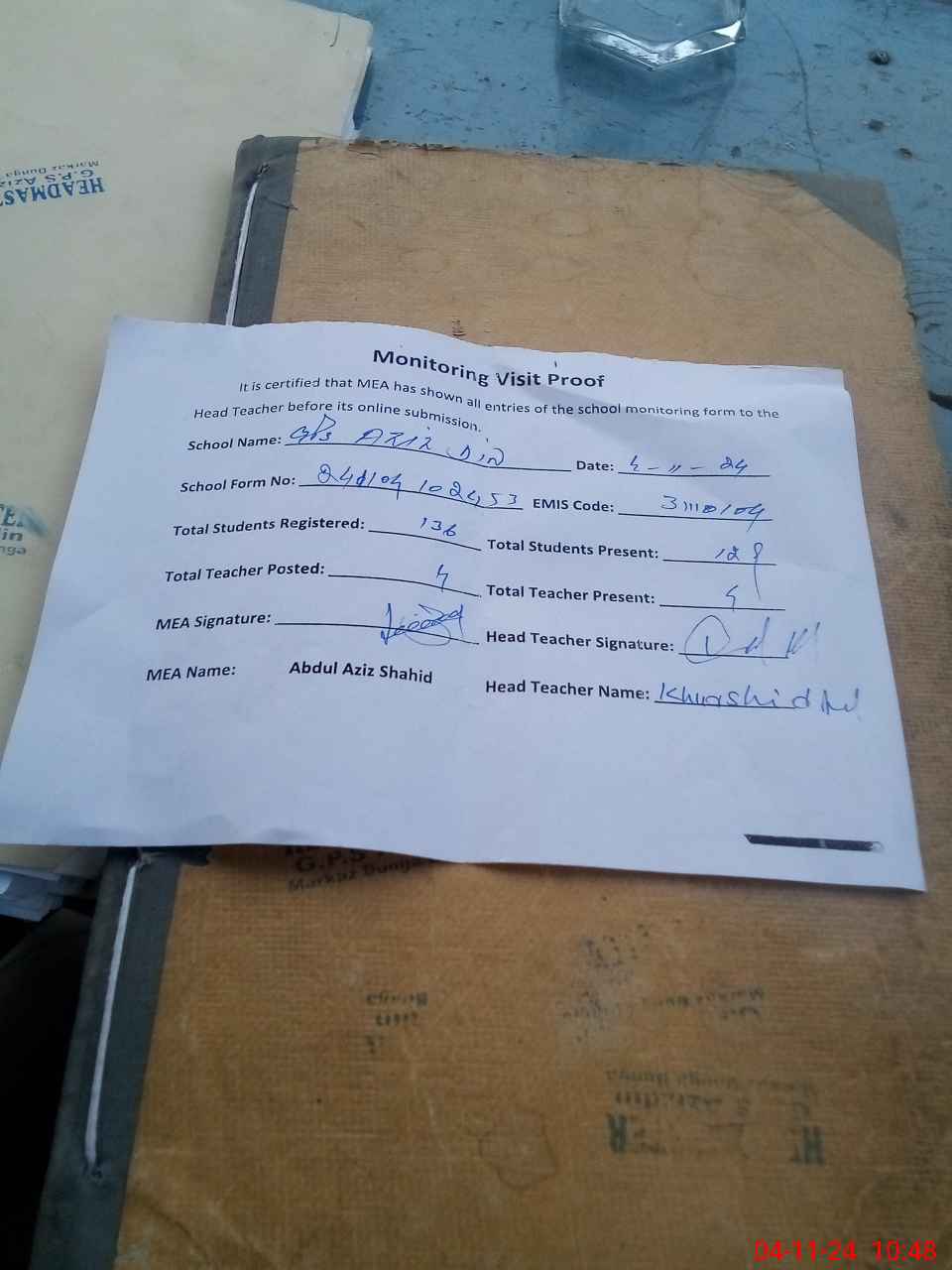 | EMIS Code: 31110104 | Name of School: GPS AZIZ DIN | |||