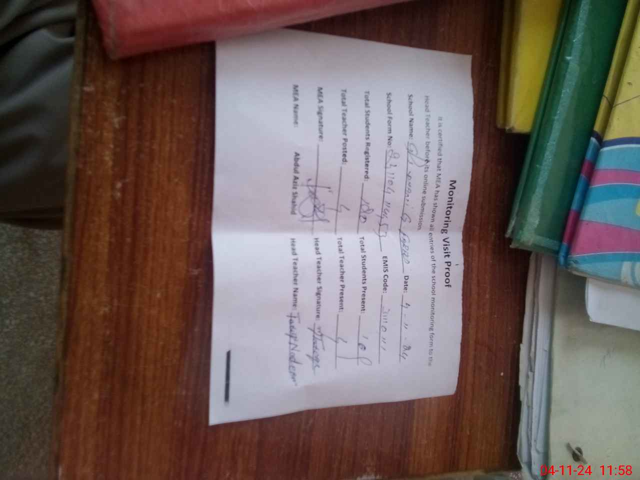 | Attendance Register | Head Teacher | MEA with School | Visit Proof |