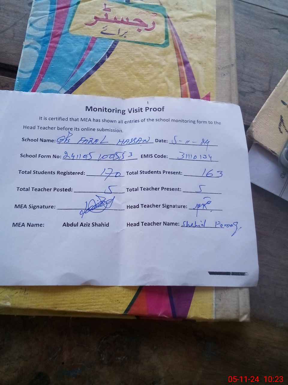 | Attendance Register | Head Teacher | MEA with School | Visit Proof |