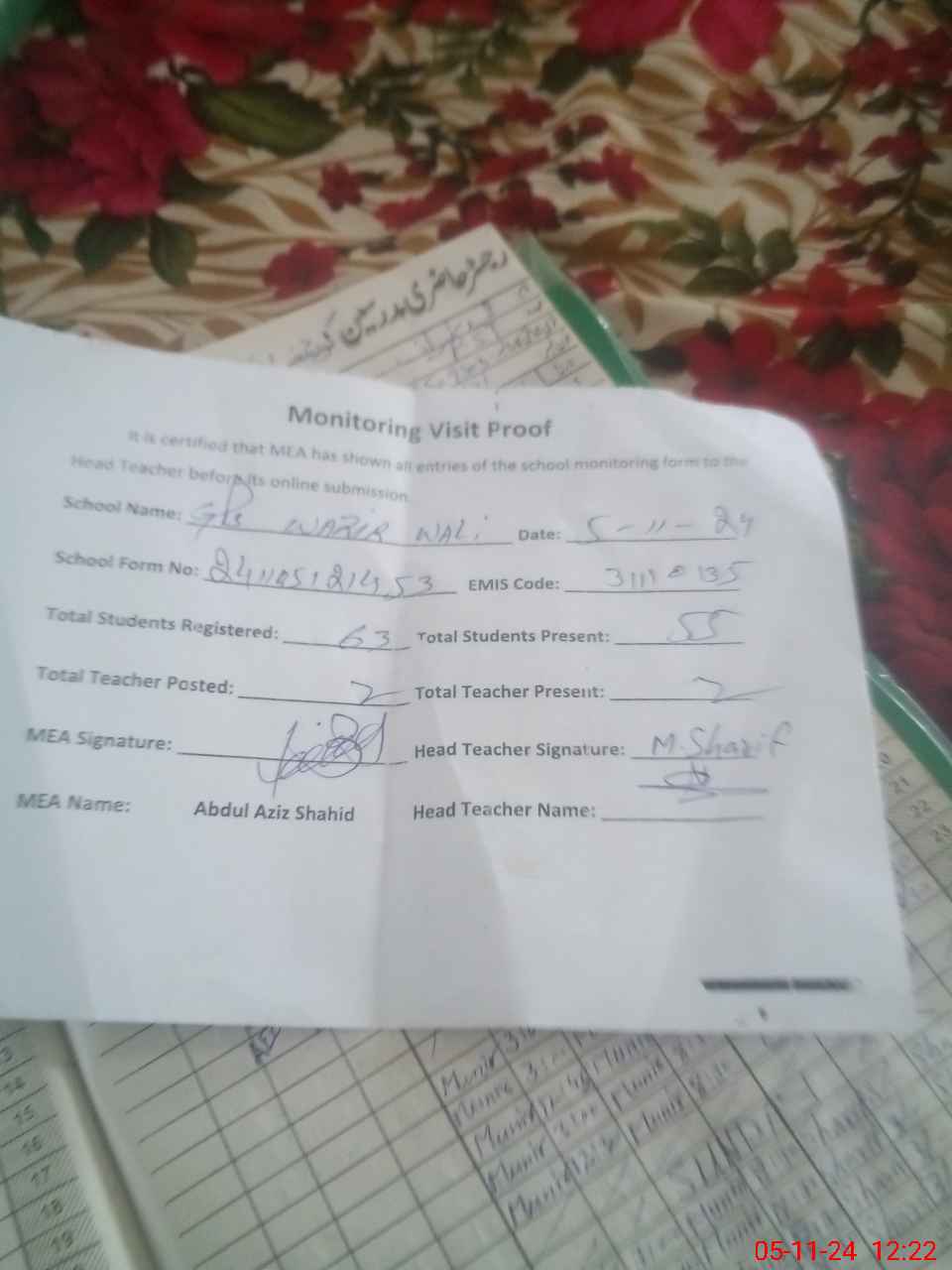 | EMIS Code: 31110135 | Name of School: GPS WAZIR WALI | |||