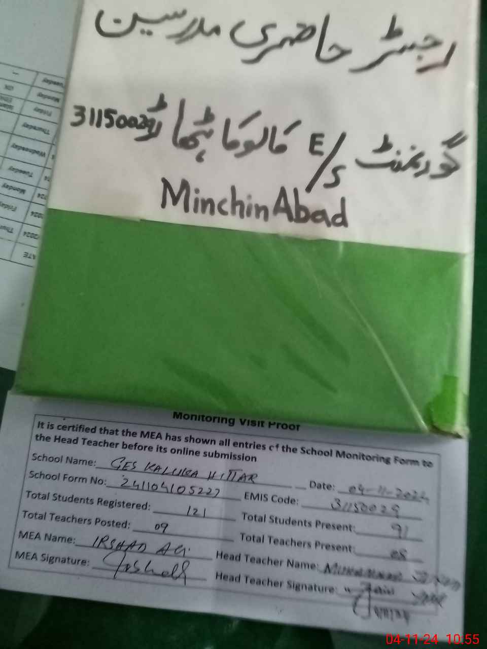 | Attendance Register | Head Teacher | MEA with School | Visit Proof |