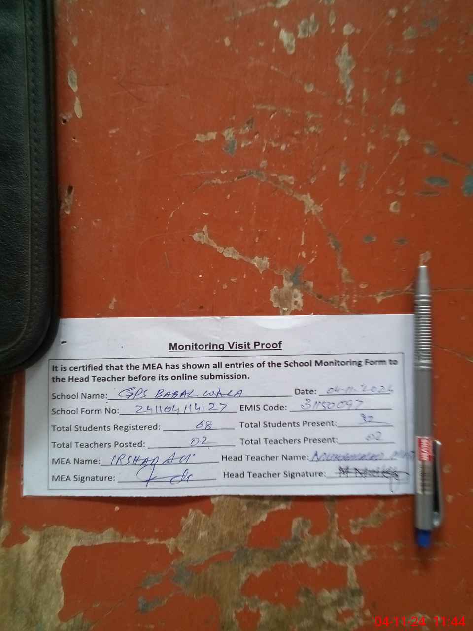 | Attendance Register | Head Teacher | MEA with School | Visit Proof |