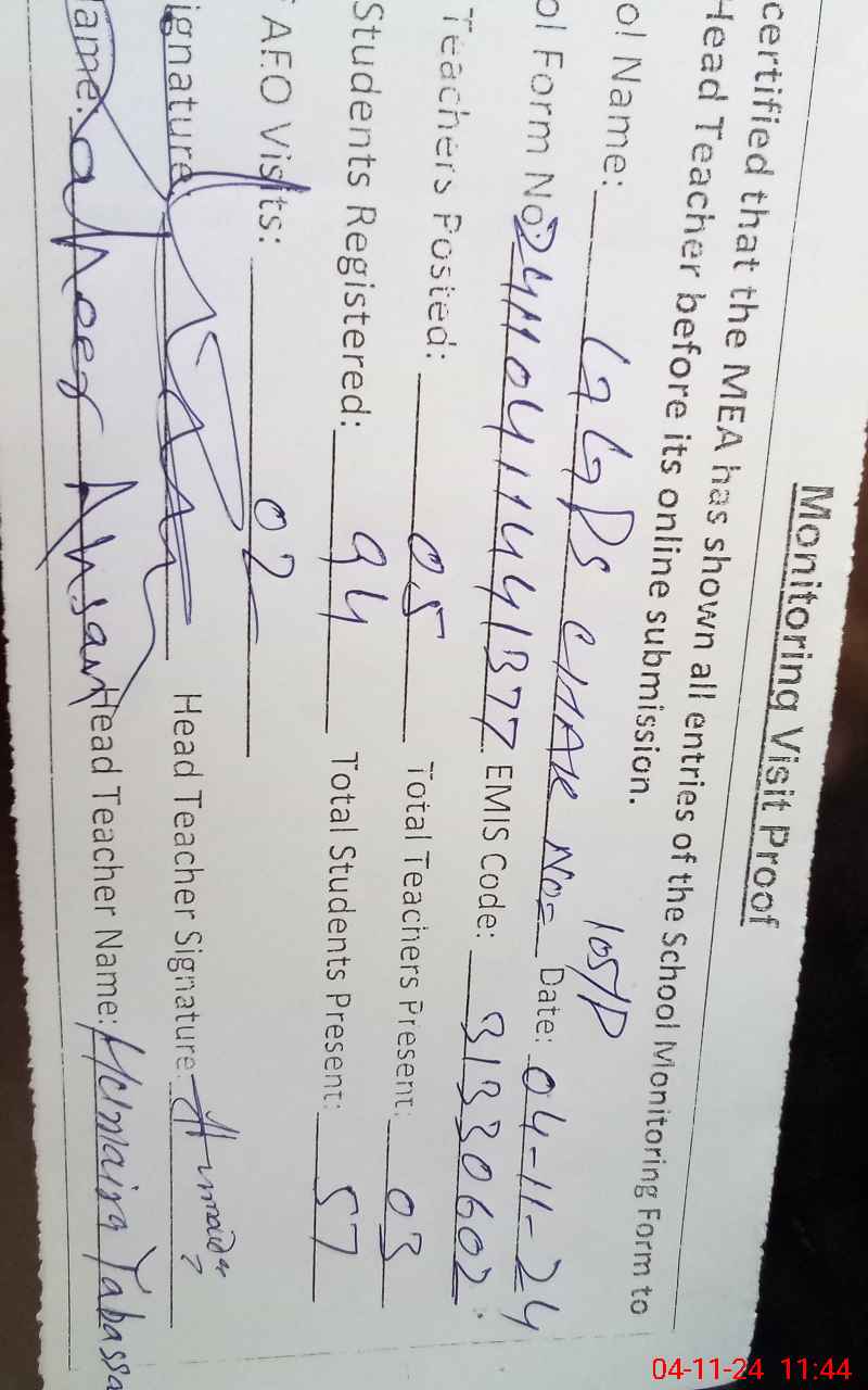 | Attendance Register | Head Teacher | MEA with School | Visit Proof |