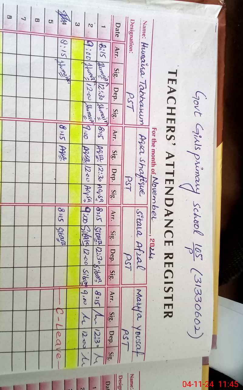 | Remarks (Use Separate Page if Required): Sir Teacher Marya Yousaf is absented but shown her on leave in teacher roll call register Online leave apply after 1130hrs | |||||