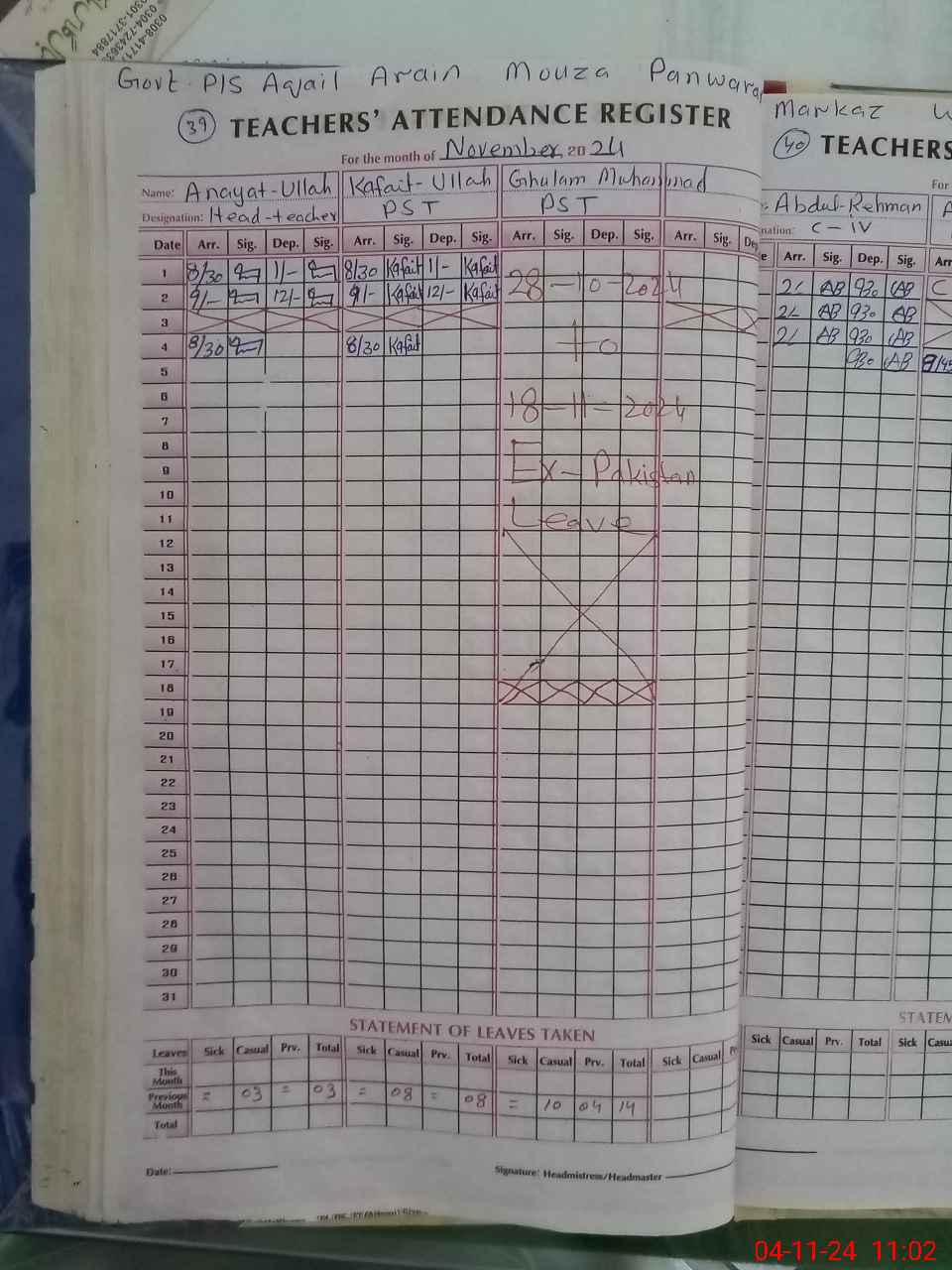 | Leave | Duty | Absent | Maternity | Medical | Ex- Pak |