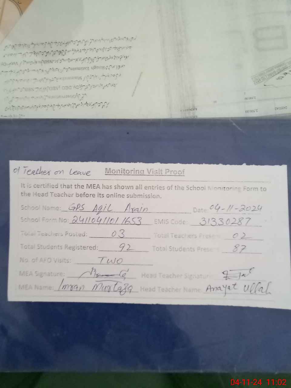 | Attendance Register | Head Teacher | MEA with School | Visit Proof |