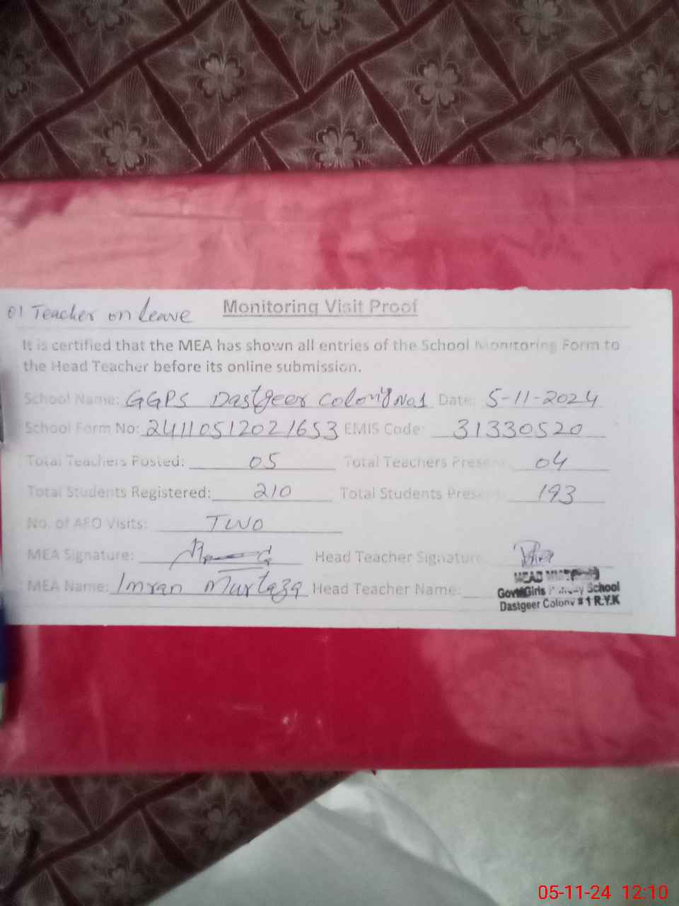 | Attendance Register | Head Teacher | MEA with School | Visit Proof |