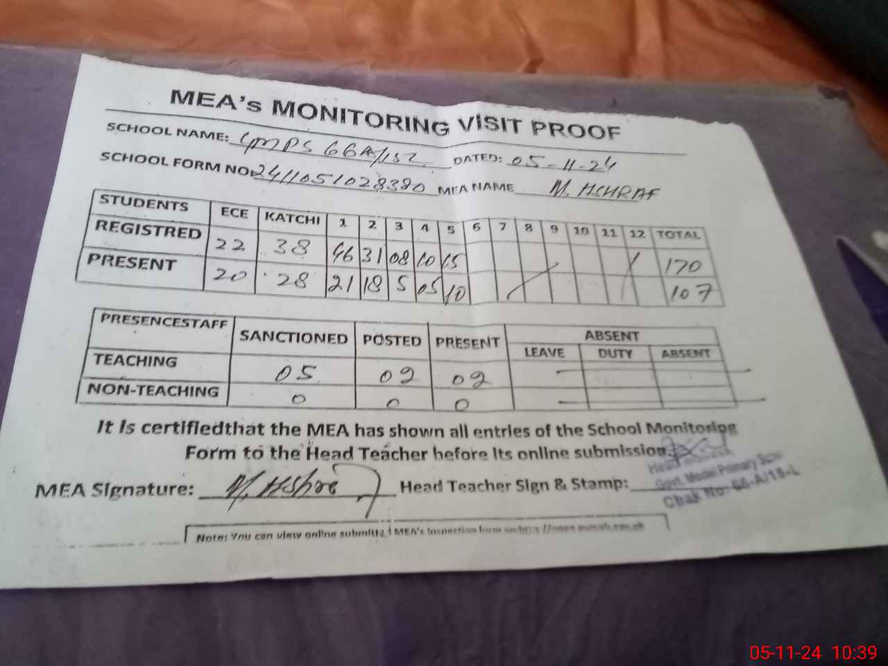 | Attendance Register | Head Teacher | MEA with School | Visit Proof |