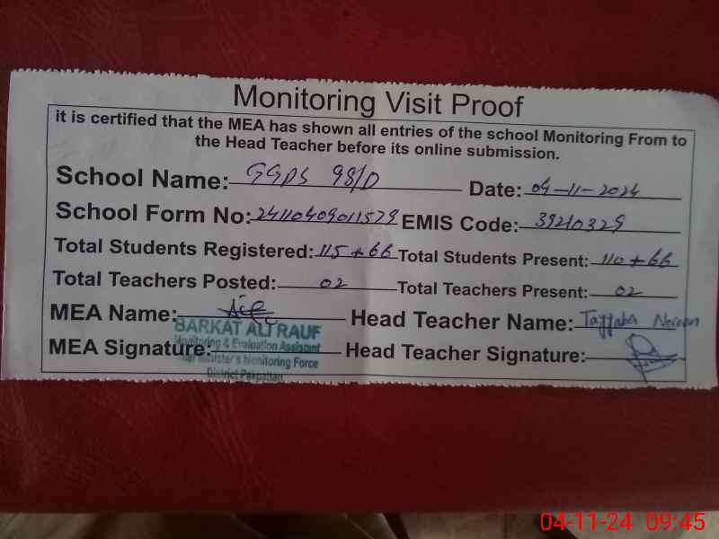 | EMIS Code: 39210329 | Name of School: GGPS 98 D | |||