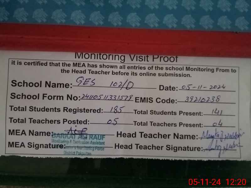 | EMIS Code: 39210238 | Name of School: GES CHAK NO. 102 /D | |||