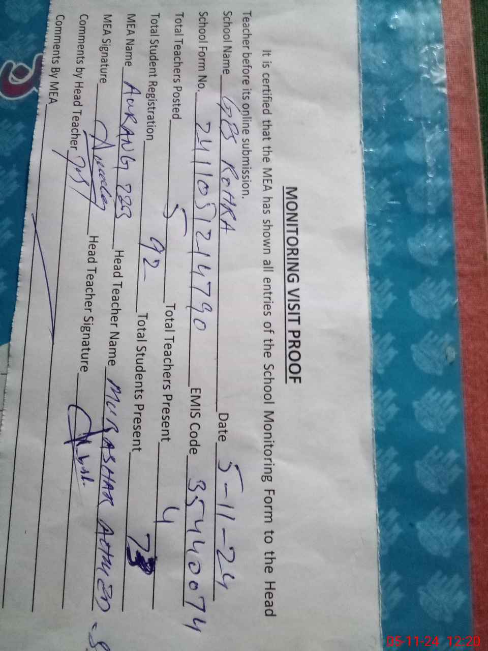 | Attendance Register | Head Teacher | MEA with School | Visit Proof |