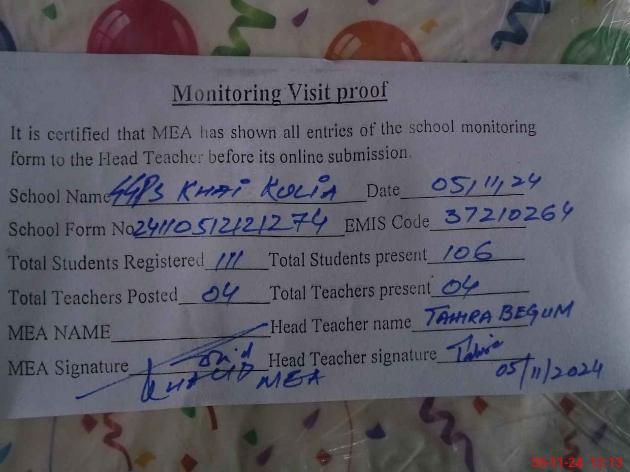 | Attendance Register | Head Teacher | MEA with School | Visit Proof |