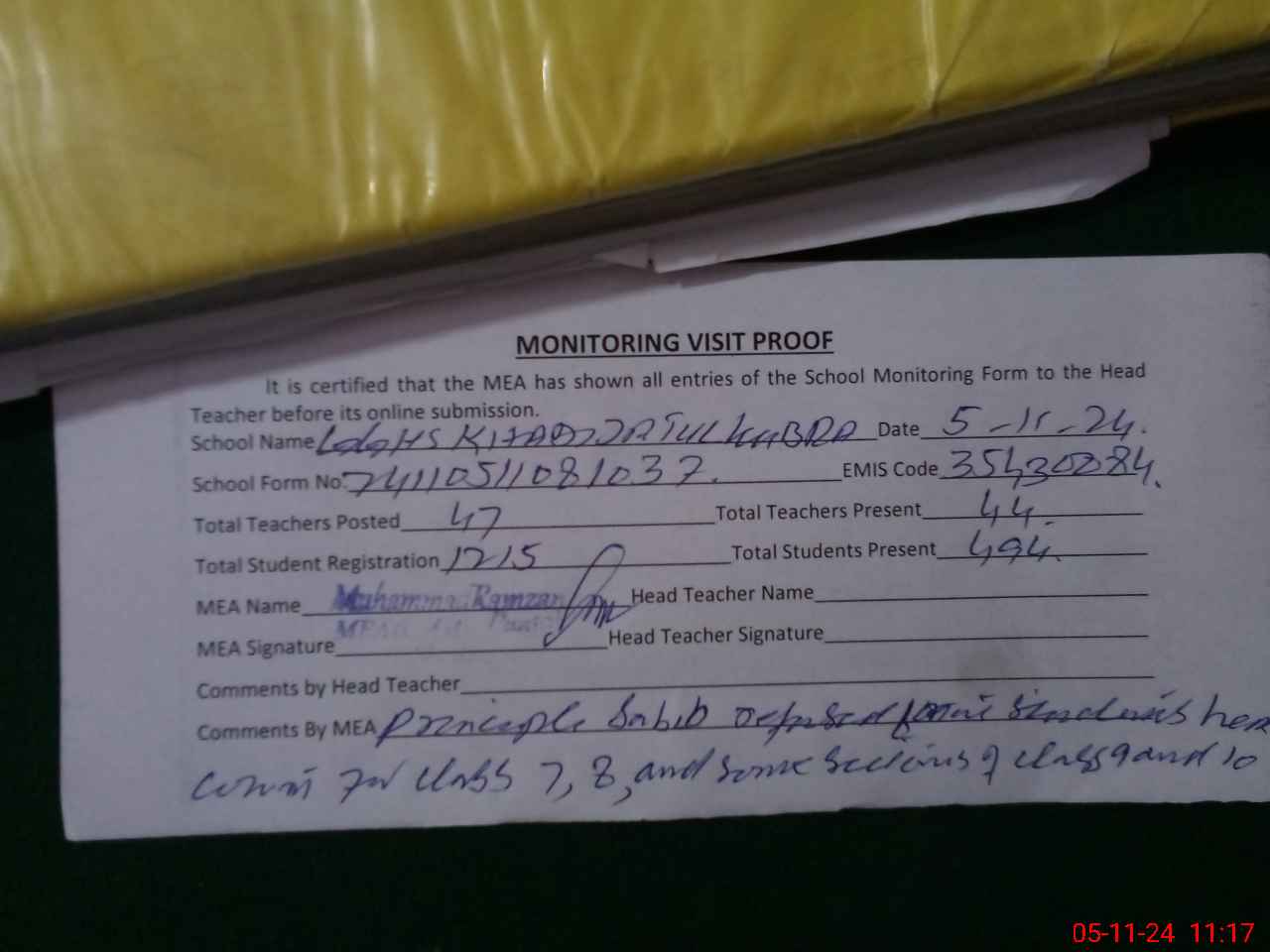 | Remarks (Use Separate Page if Required): Principal refuse and not permitted the MEA for students head count class 7 8 9 and 10 Except some Class sections for head counting compelling me to filling up information by sitting in offs So I did not don so Not sign the visit proof nor return the same | |||||