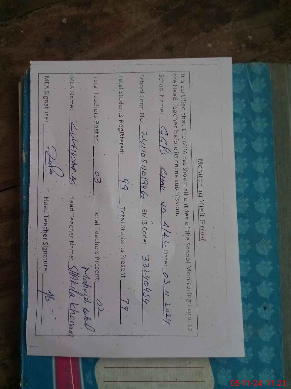 | Name: SH**** KH**** Designation: (School Headmaster's/Headmistress's) PST Phone/Cell Number: 03**** |