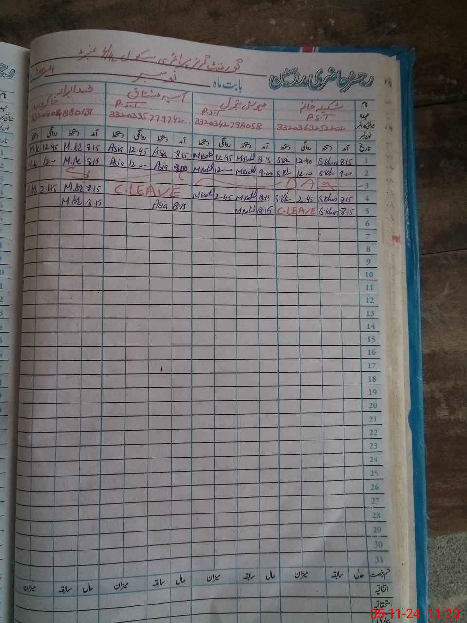 | CNIC | Full Name | Designation | R/C | Absence During Last Calender Month |