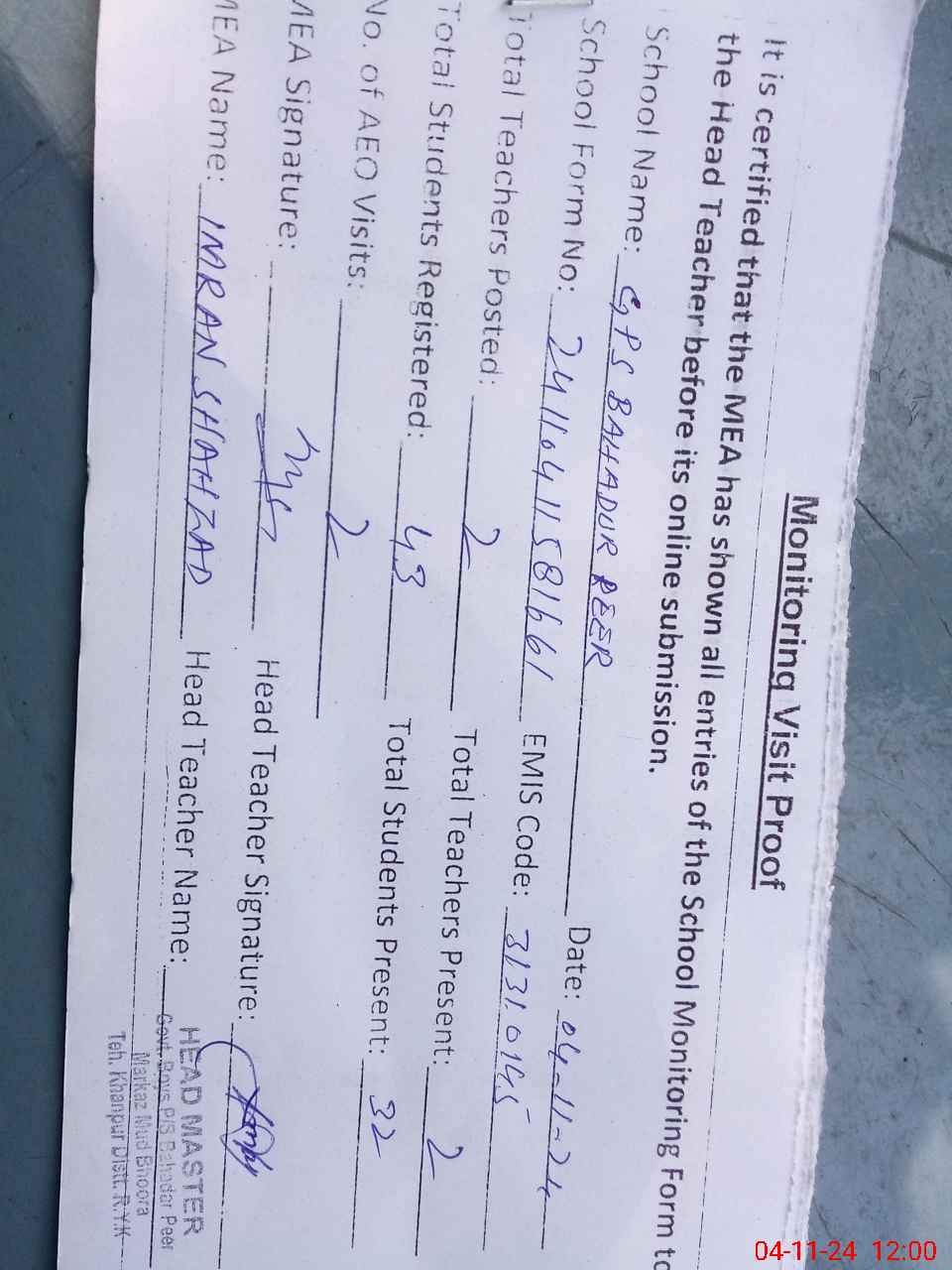 | EMIS Code: 31310145 | Name of School: GPS BAHADUR PEER | |||