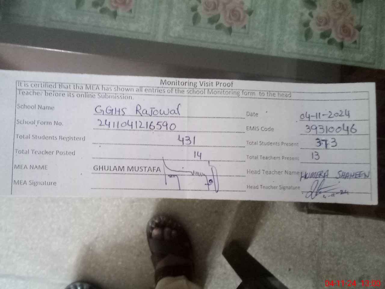 | Attendance Register | Head Teacher | MEA with School | Visit Proof |