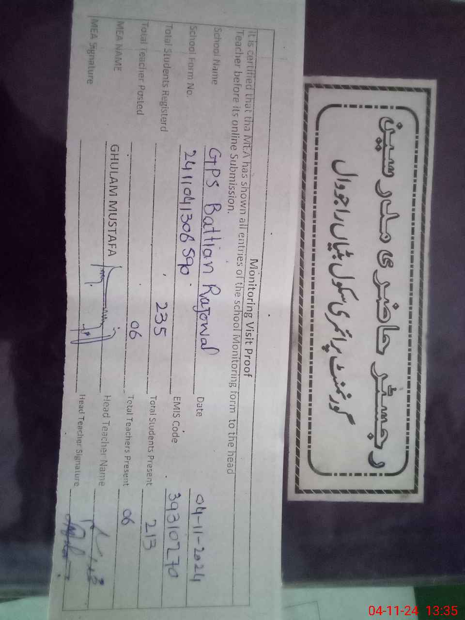 | Attendance Register | Head Teacher | MEA with School | Visit Proof |