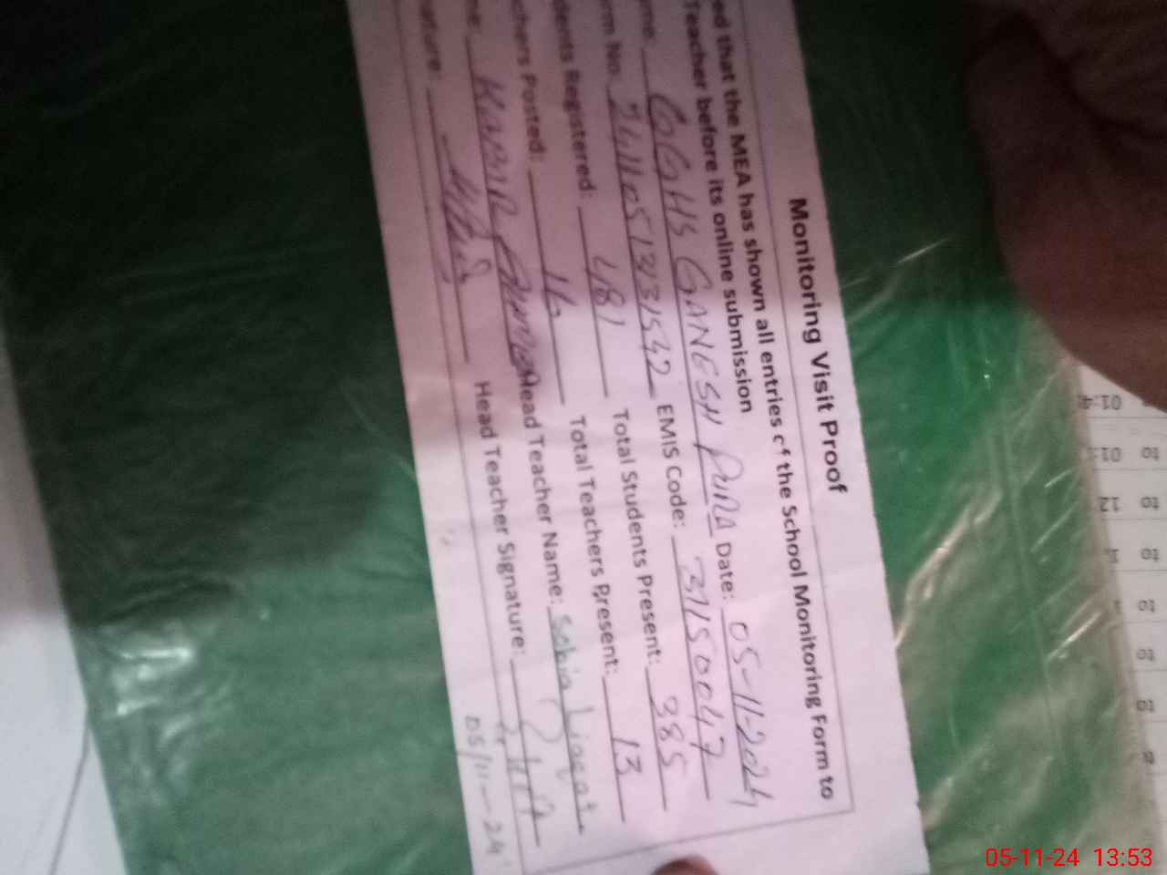 | Attendance Register | Head Teacher | MEA with School | Visit Proof |