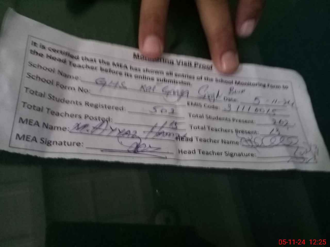 | Attendance Register | Head Teacher | MEA with School | Visit Proof |