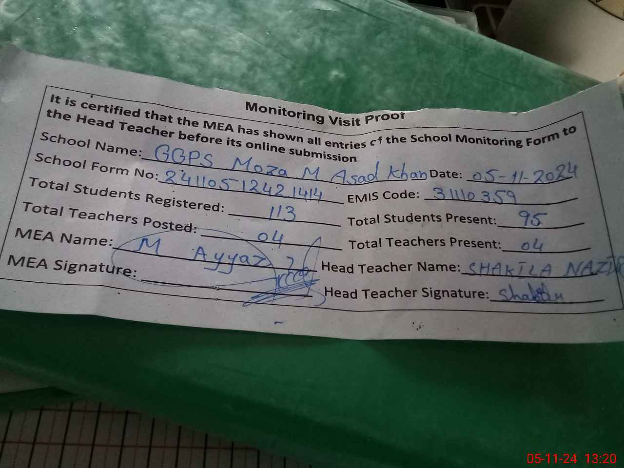 | Attendance Register | Head Teacher | MEA with School | Visit Proof |