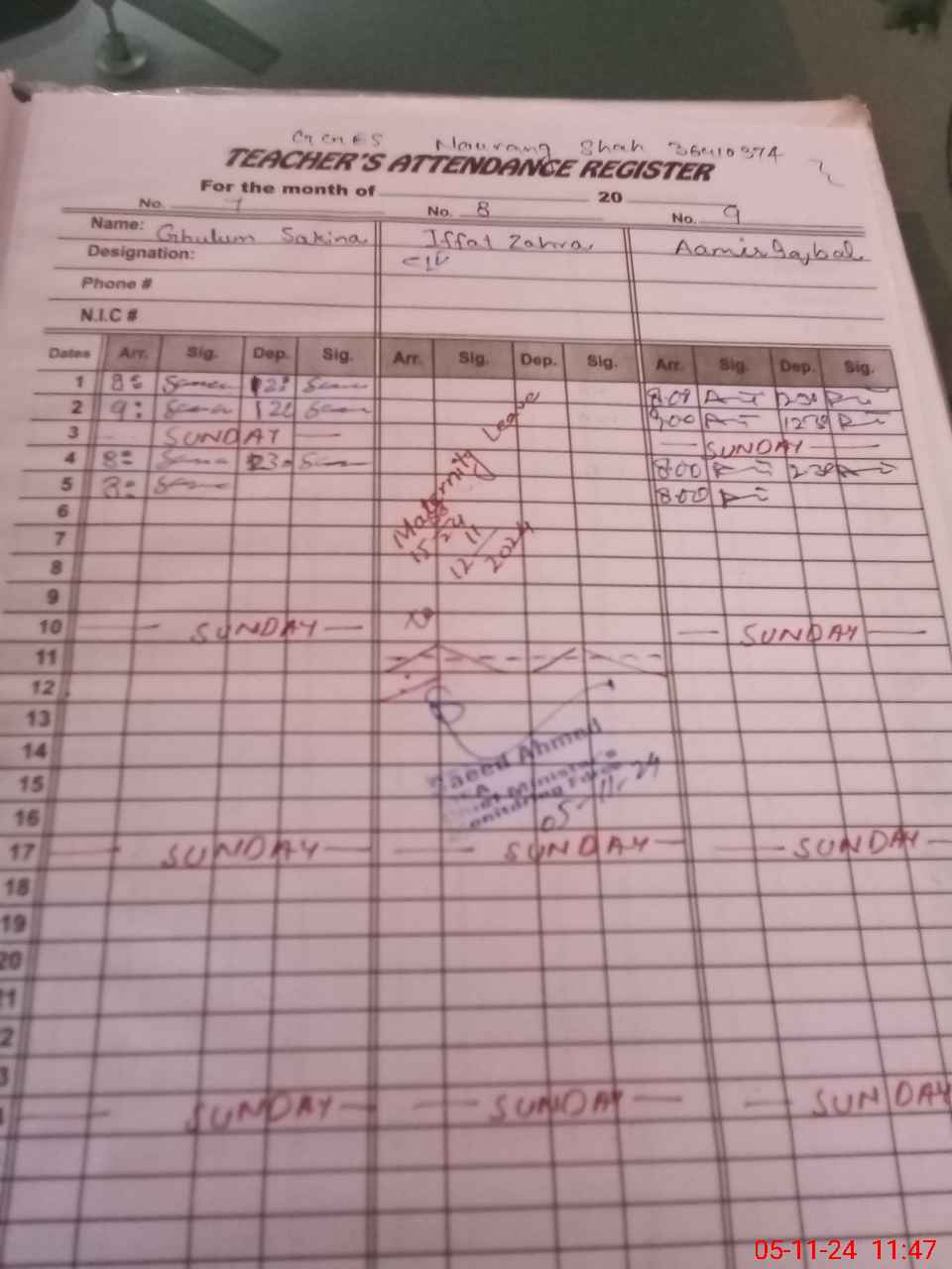 | CNIC | Full Name | Designation | R/C | Absence During Last Calender Month |