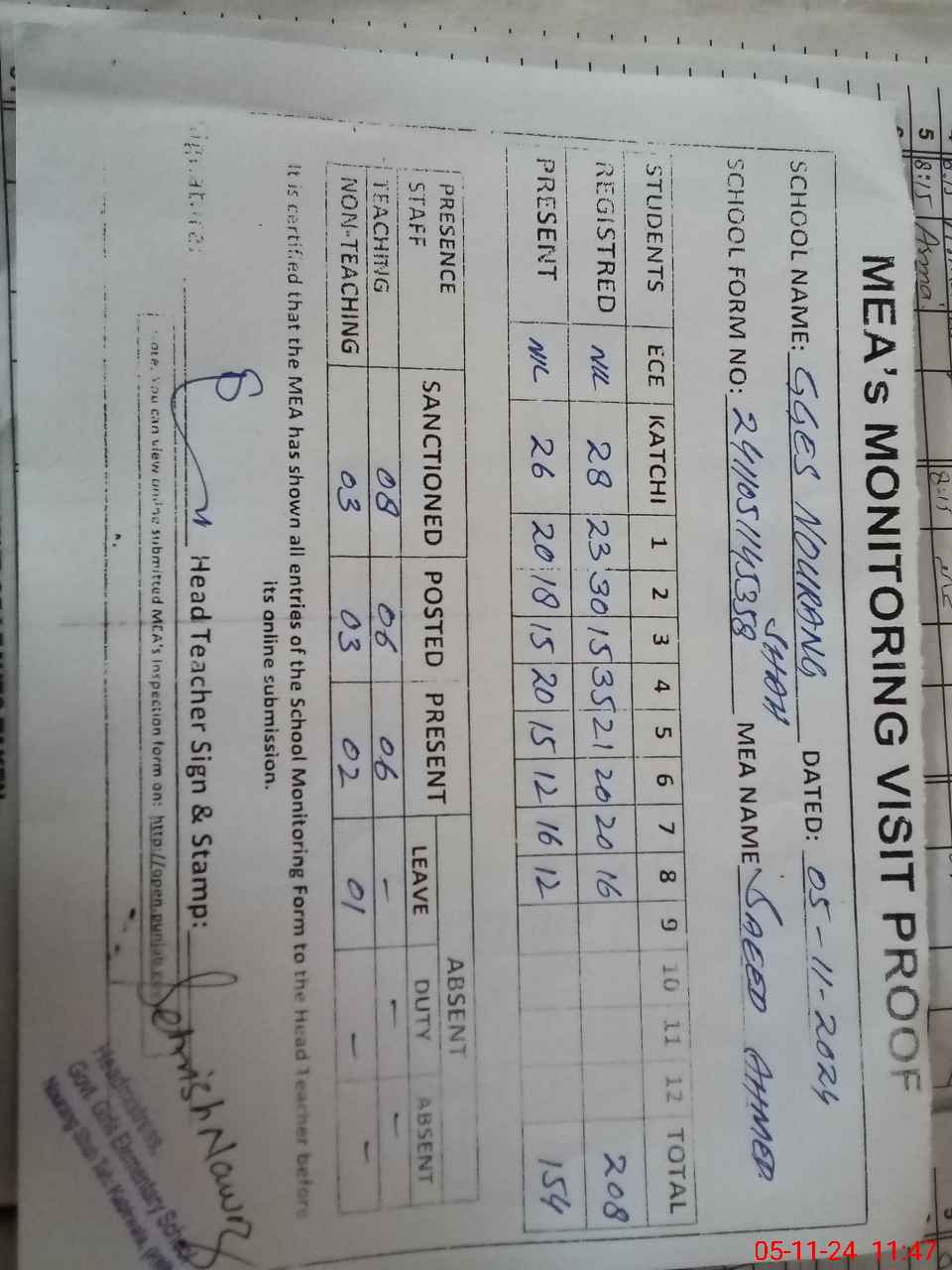 | Attendance Register | Head Teacher | MEA with School | Visit Proof |