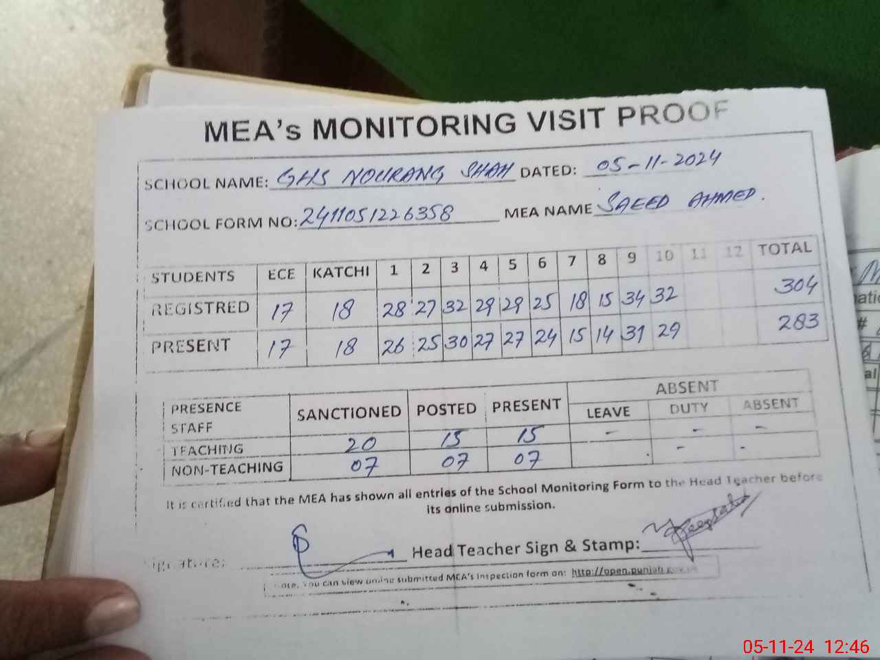 | EMIS Code: 36410010 | Name of School: GHS NOURANG SHAH, P/O HASHMAT MIRALI, KABIRWALA | |||