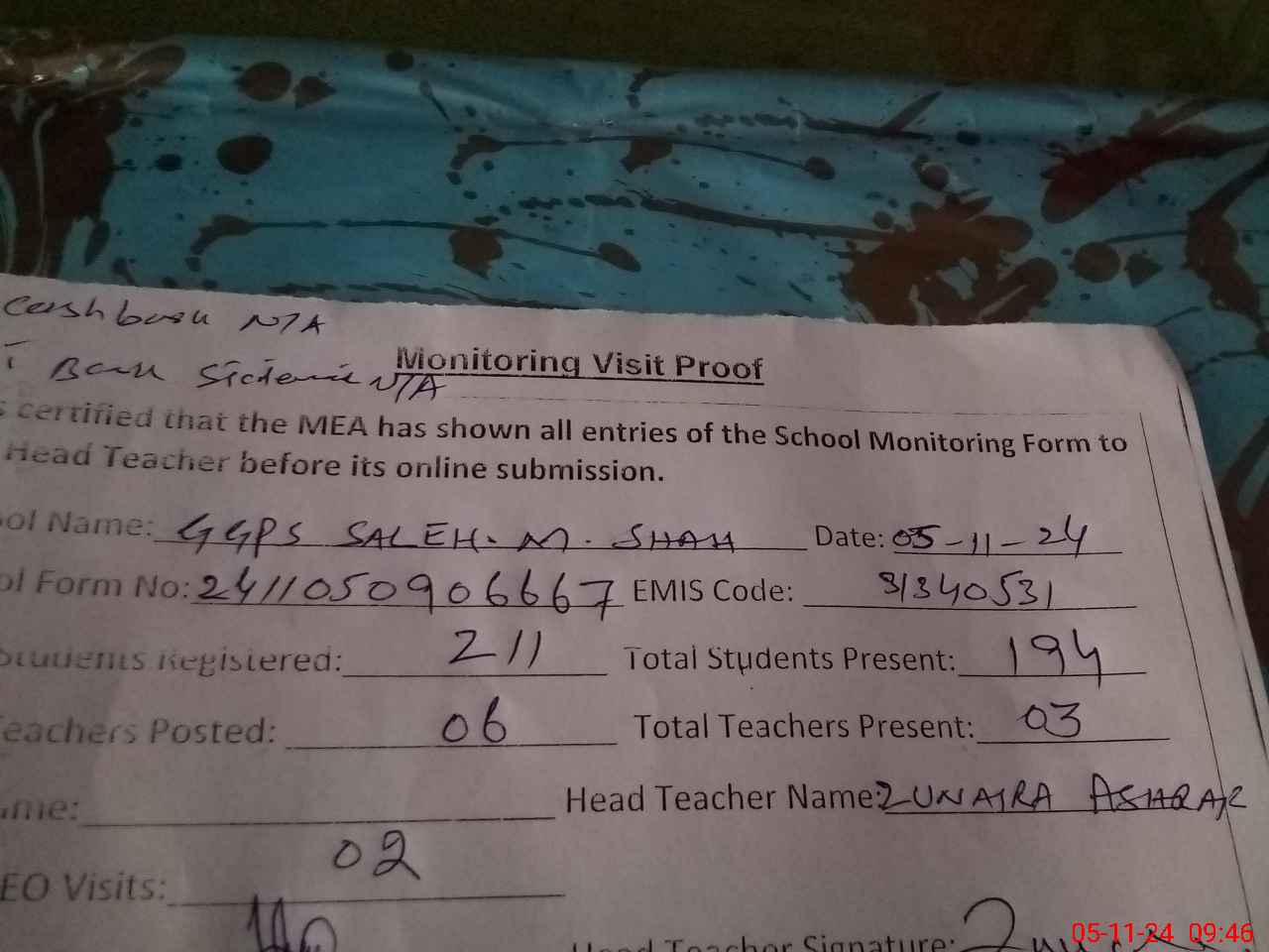 | Attendance Register | Head Teacher | MEA with School | Visit Proof |