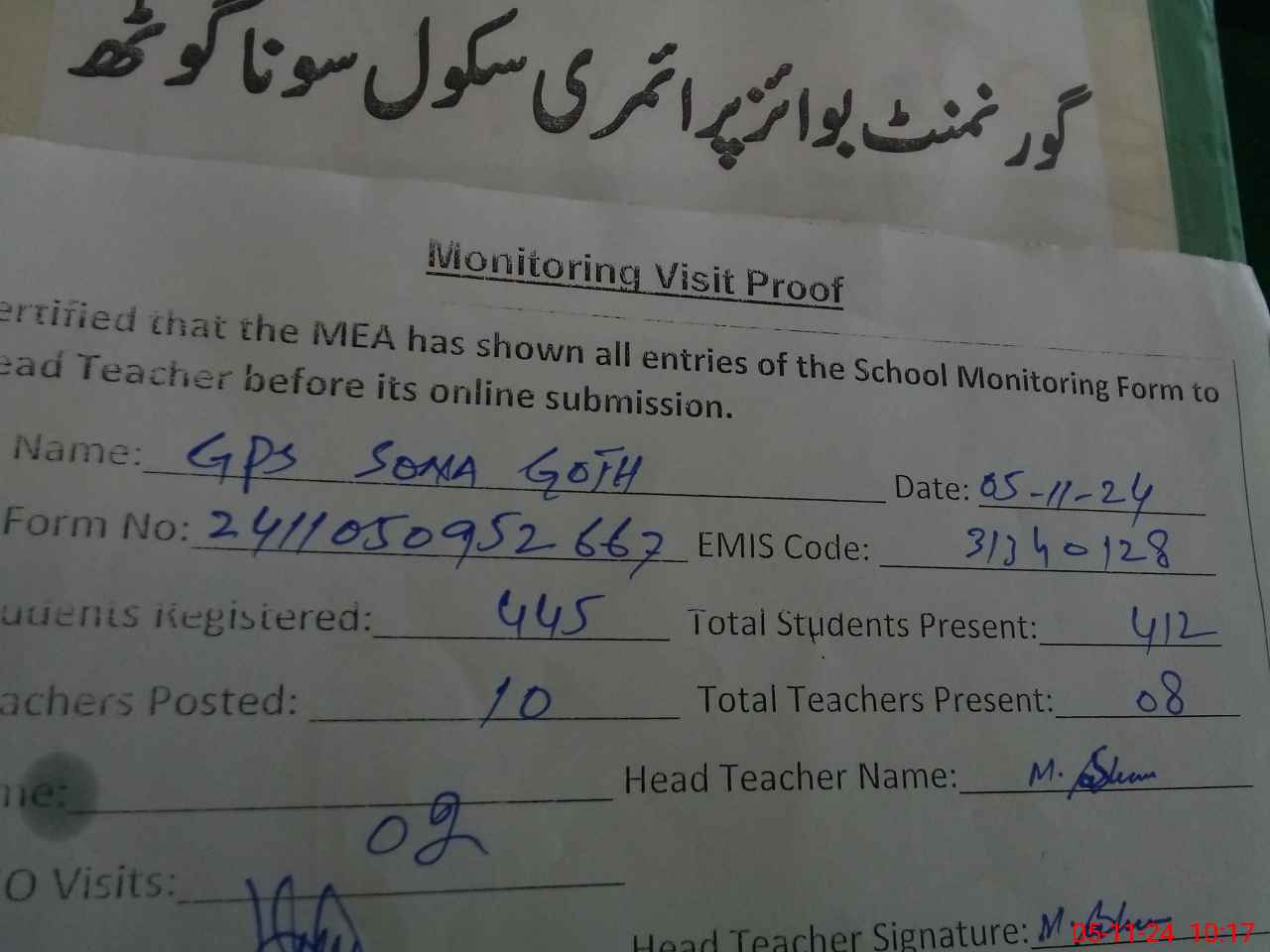 | Attendance Register | Head Teacher | MEA with School | Visit Proof |