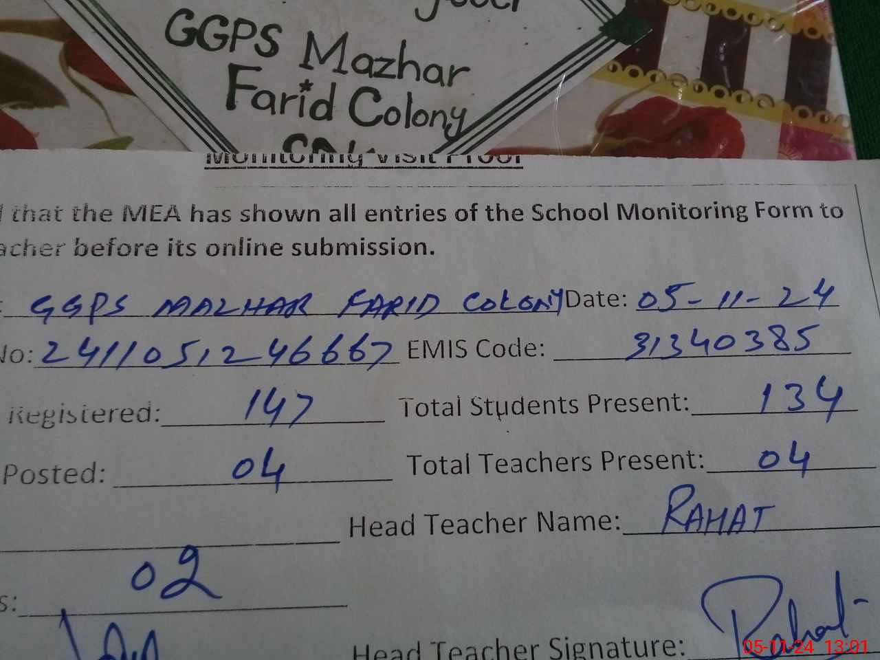 | Attendance Register | Head Teacher | MEA with School | Visit Proof |