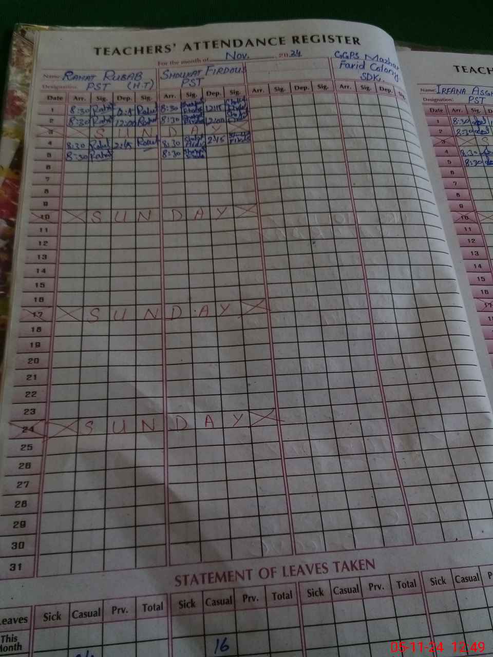 | CNIC | Full Name | Designation | R/C | Absence During Last Calender Month |