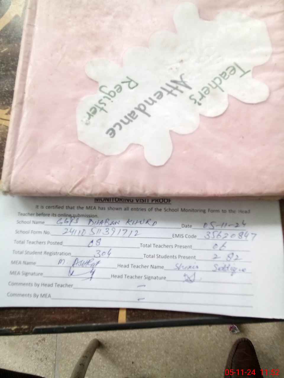 | Attendance Register | Head Teacher | MEA with School | Visit Proof |