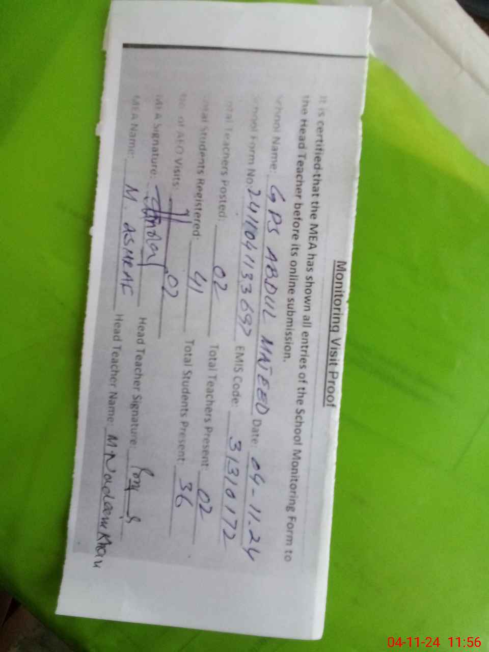 | Attendance Register | Head Teacher | MEA with School | Visit Proof |
