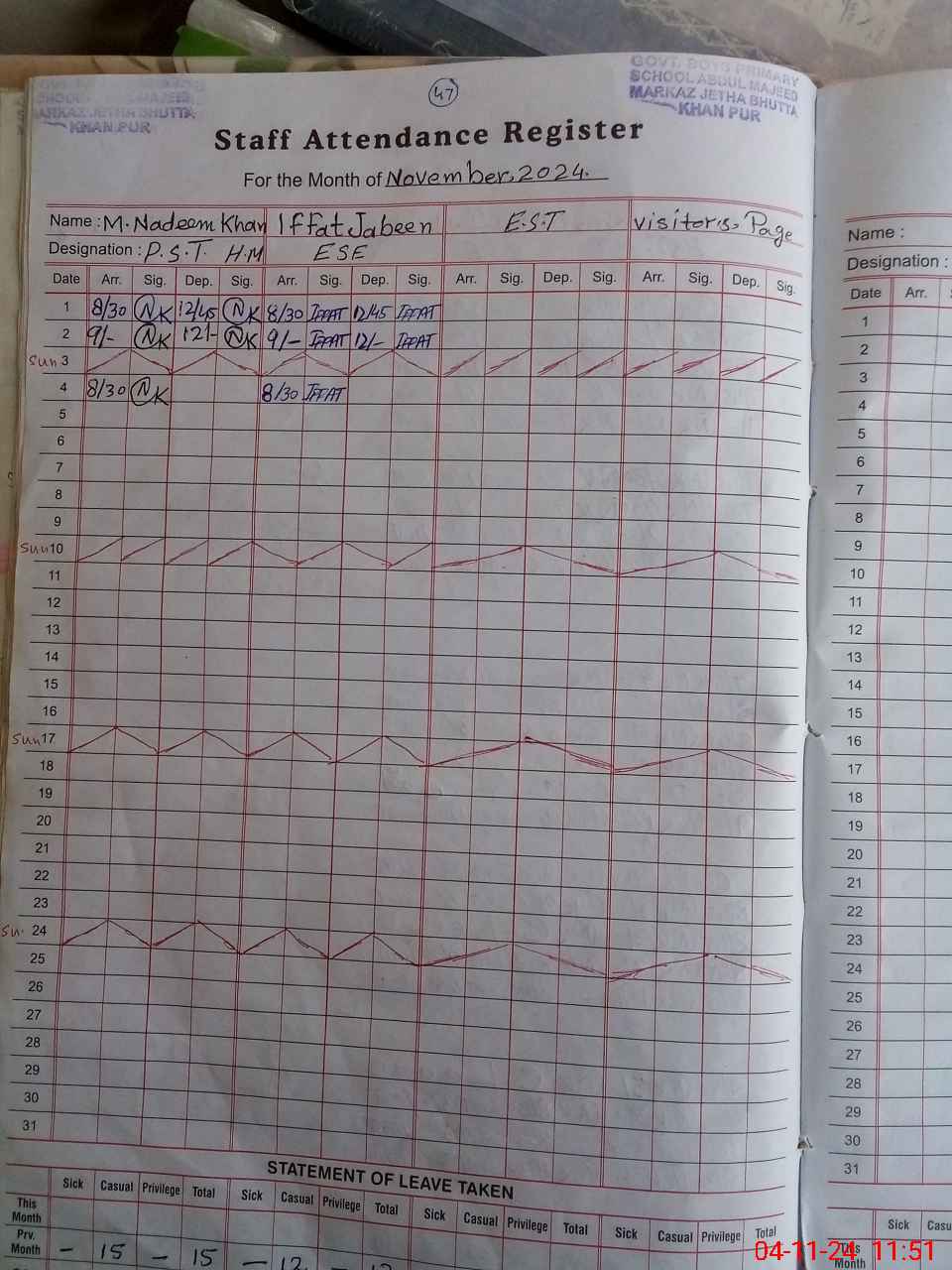 | Monitoring Date: 04-11-2024 | Start Time: 04-11-2024 11:33 AM | End Time: 04-11-2024 11:57 AM | Name of MEA: Mu**** As**** KP**** | |