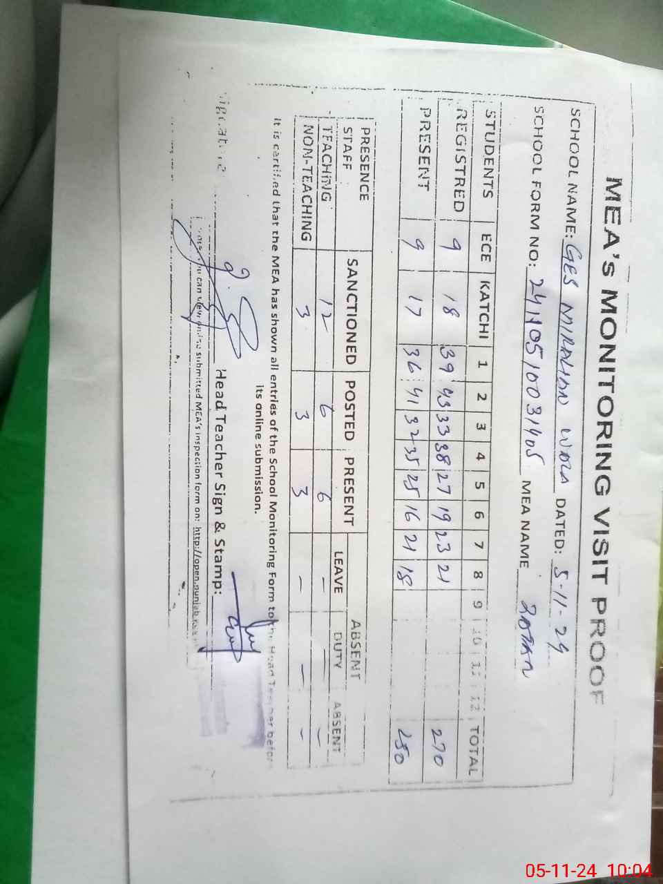 | Attendance Register | Head Teacher | MEA with School | Visit Proof |