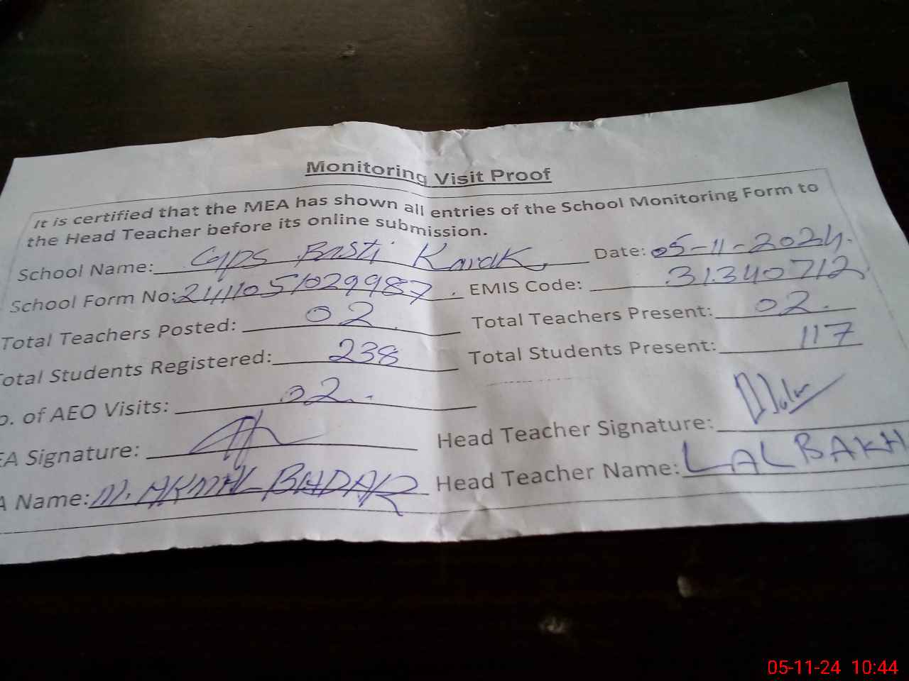 | Attendance Register | Head Teacher | MEA with School | Visit Proof |
