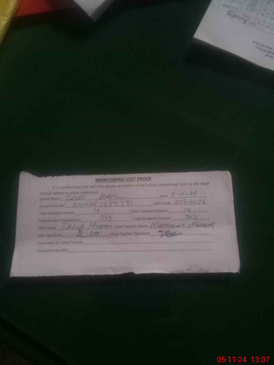 | Attendance Register | Head Teacher | MEA with School | Visit Proof |