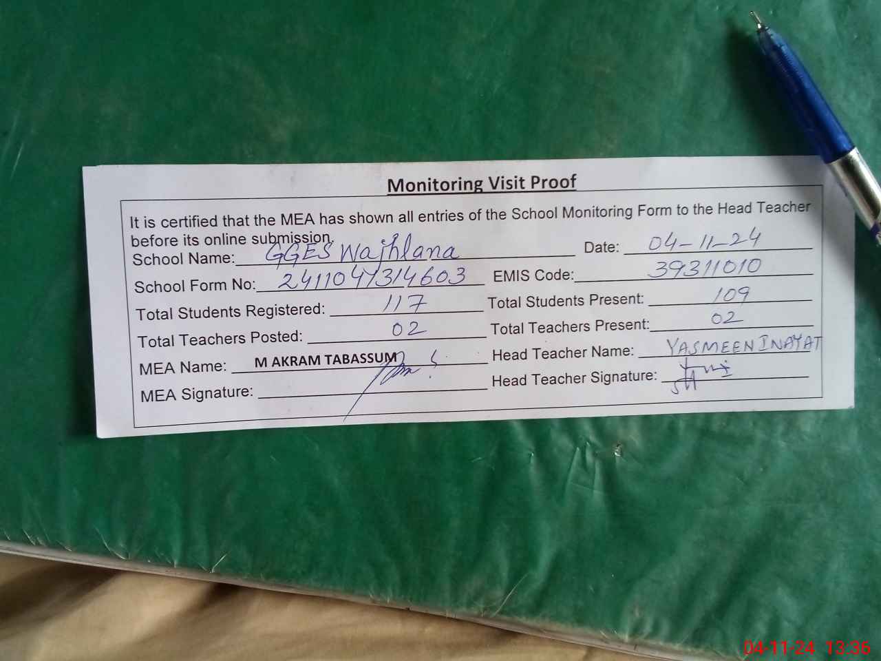 | Attendance Register | Head Teacher | MEA with School | Visit Proof |
