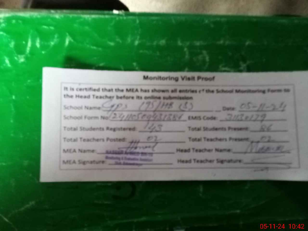| Attendance Register | Head Teacher | MEA with School | Visit Proof |
