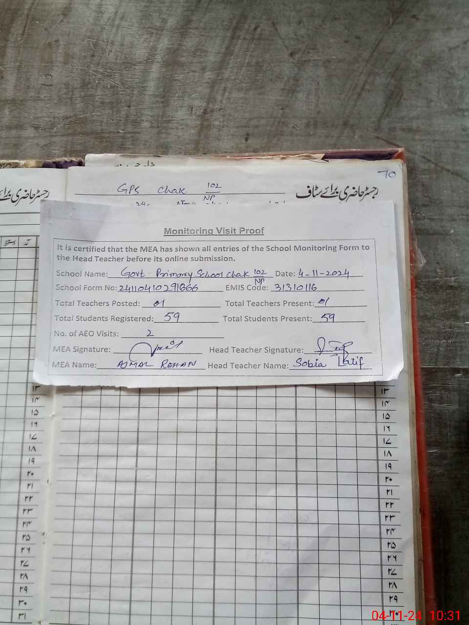 | Attendance Register | Head Teacher | MEA with School | Visit Proof |