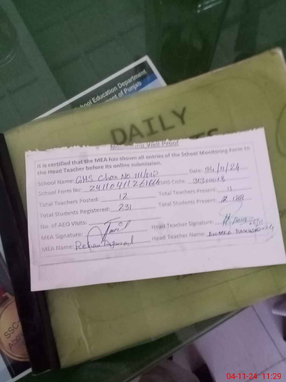 | EMIS Code: 31310018 | Name of School: GHS CHAK 111 NP | |||