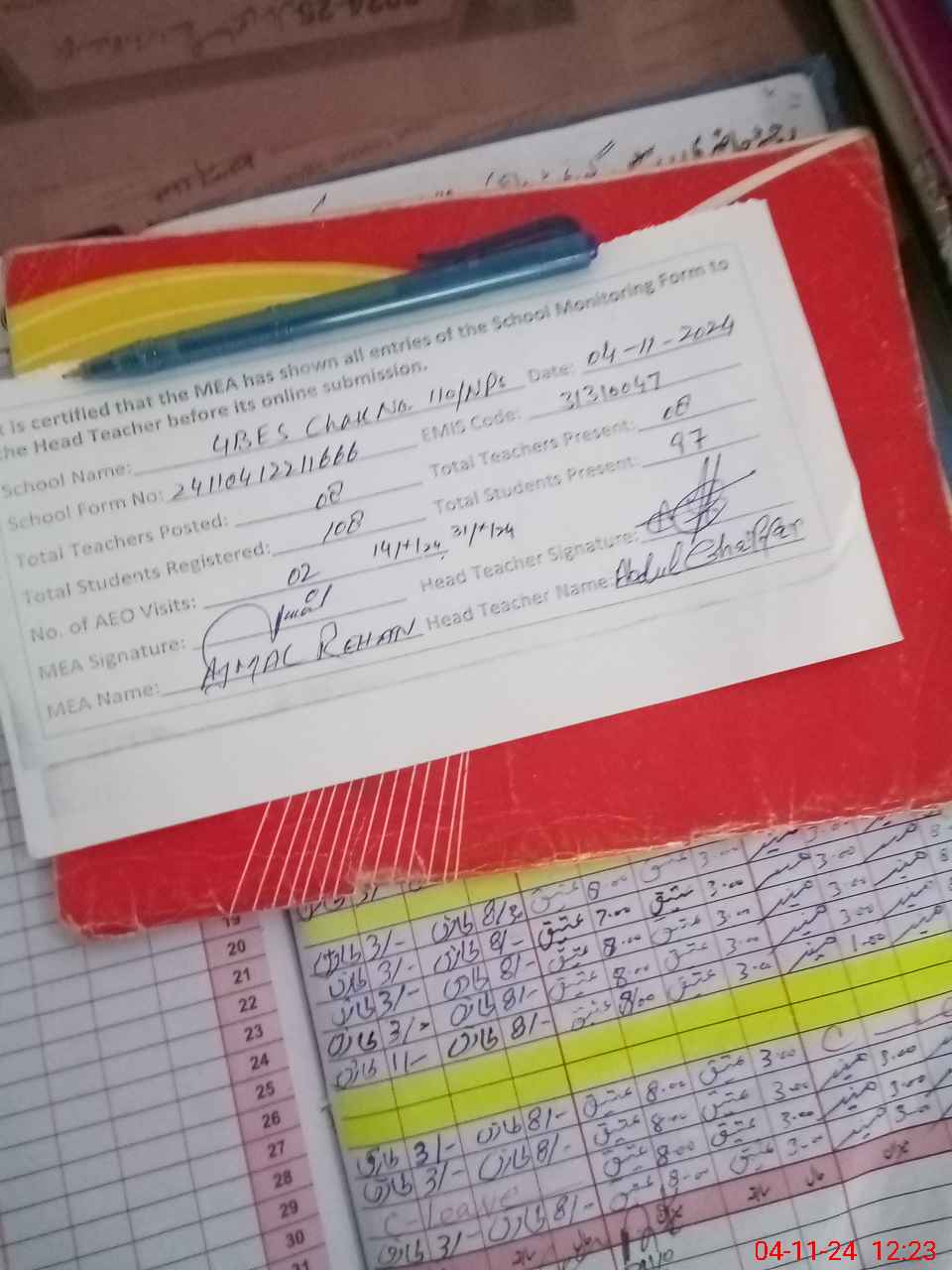 | Attendance Register | Head Teacher | MEA with School | Visit Proof |